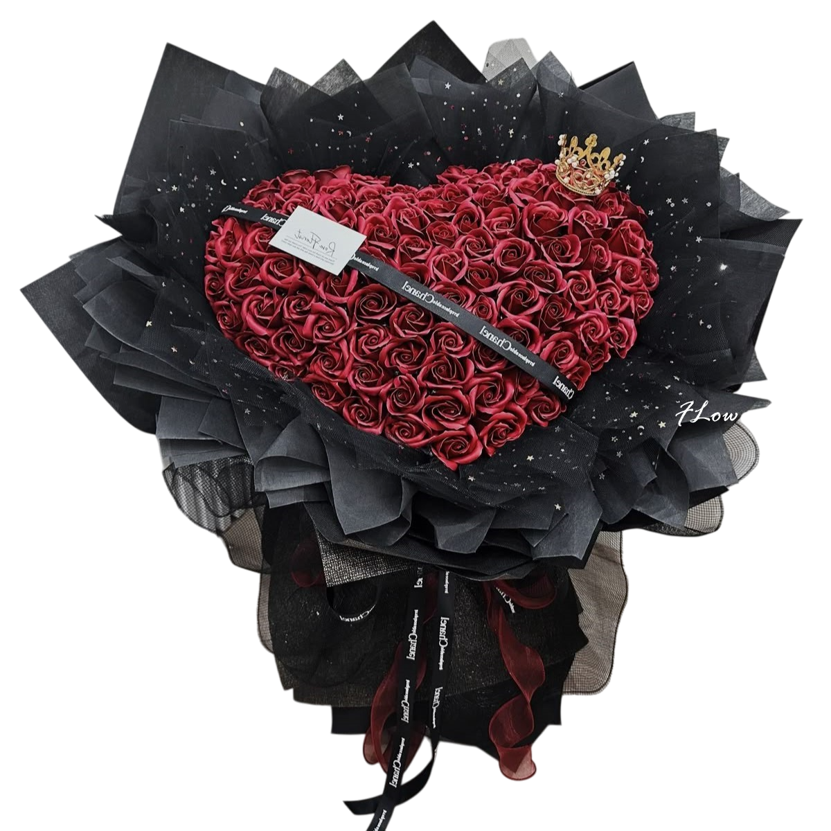 Bó hoa được thiết kế theo phong cách lãng mạn, sang trọng và đầy nữ tính, với 100 bông hoa hồng sáp màu đỏ đô – gam màu của sự quyến rũ, sâu sắc và tình yêu trưởng thành. Thiết kế mang cảm hứng “công chúa” với nơ lụa lớn, lớp giấy gói mềm mại xếp tầng và phần đuôi váy xoè nhẹ như một chiếc đầm dạ hội.